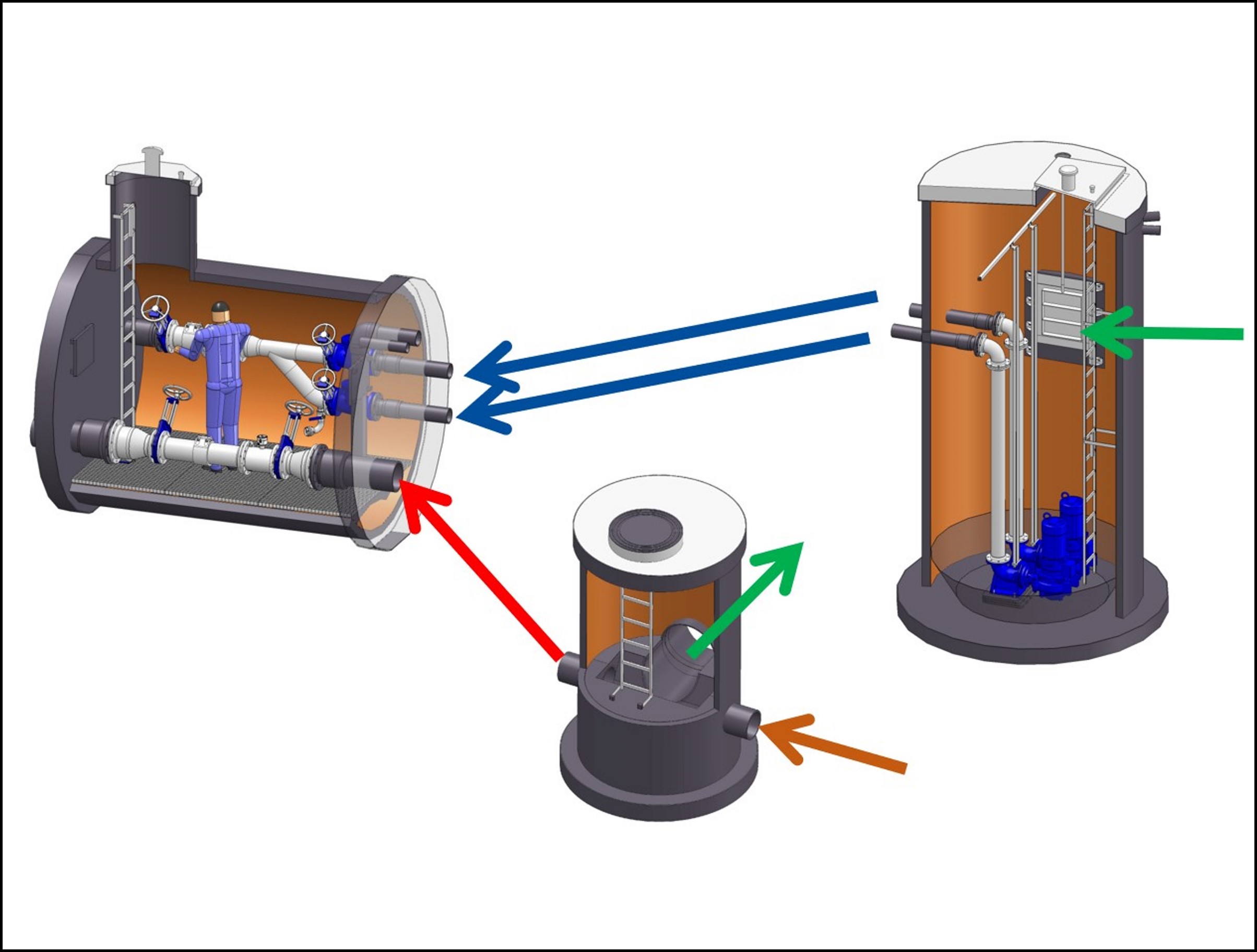 Armaturenschächte für Pumpstationen in Nassaufstellung Vorteile Keine Korrosionsgefahr der Armaturen Zugänglich in geringer Tiefe Sichere Arbeitsbedingungen Außerhalb des Ex-Bereiches Weniger Anlagenteile im Pumpenschacht Ausrüstung Spülanschluss Molchschleuse MID Schieber Rückschlagventile Rückschlagklappen Vakuumbrecher Entlüftungsventile Ausrüstung Behälter als doppelwandiges PE-HD Wickelrohr mit Schachtabdeckplatte und Bodenplatte aus PE-HD mit Stahlbetonkern Fertigteile aus Stahlbeton nach DIN 4034 Teil 1